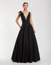This elegant crepe ball gown features a plunging neckline, bow detail on the shoulder, and practical pockets, blending timeless sophistication with modern flair. Perfect for weddings and special occasions.