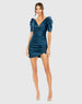 Blue V Neck Short Sleeve Satin Faux Wrap Dress