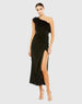 Elevate your style with our One Shoulder Draped Dress, crafted from crepe fabric. This chic dress features an asymmetrical neckline, a sleeveless design, and a striking feather detail at the neckline for added glamour. The thigh-high front slit offers effortless movement, making this dress the perfect choice for any special occasion or evening event.