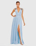 Elegant A-line gown accented with a plunging neckline and intricate bead-and-rhinestone floral accents across the shoulders and upper back.