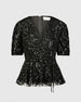 Stand out at your special event with our Sequined Puff Sleeve Faux Wrap Top, a statement piece, designed to impress. Pair it elegantly with leather pants or a chic skirt for a stylish ensemble that exudes charm and allure, perfect for cocktail parties and evening celebrations.